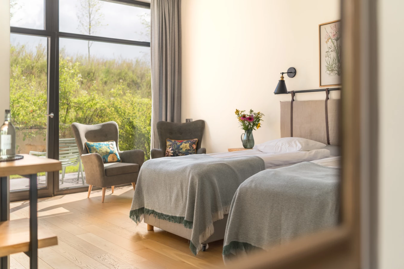 Duże okna z widokiem na łąkę, jezioro i las